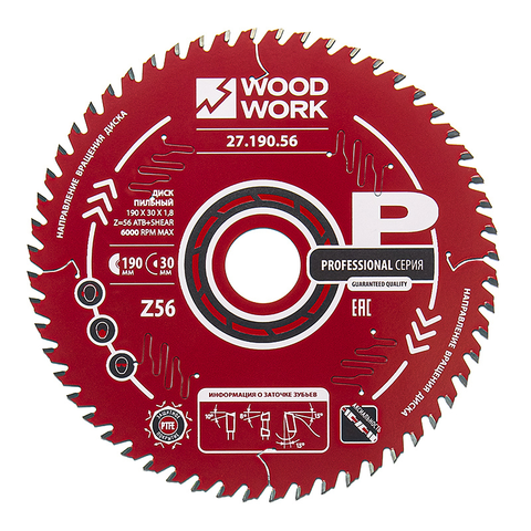 Пильный диск 190x30x1,8 мм, серии 27 Woodwork, предназначен для поперечного пиления древесины. Подходит для ручных циркулярных электро- и аккумуляторных пил, а также пильных станков.