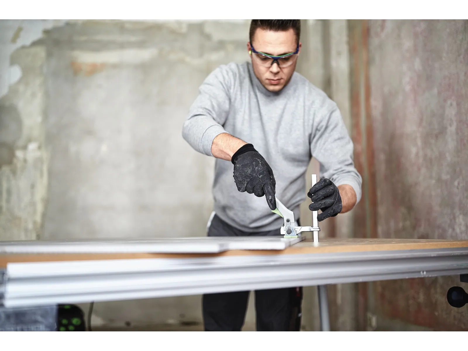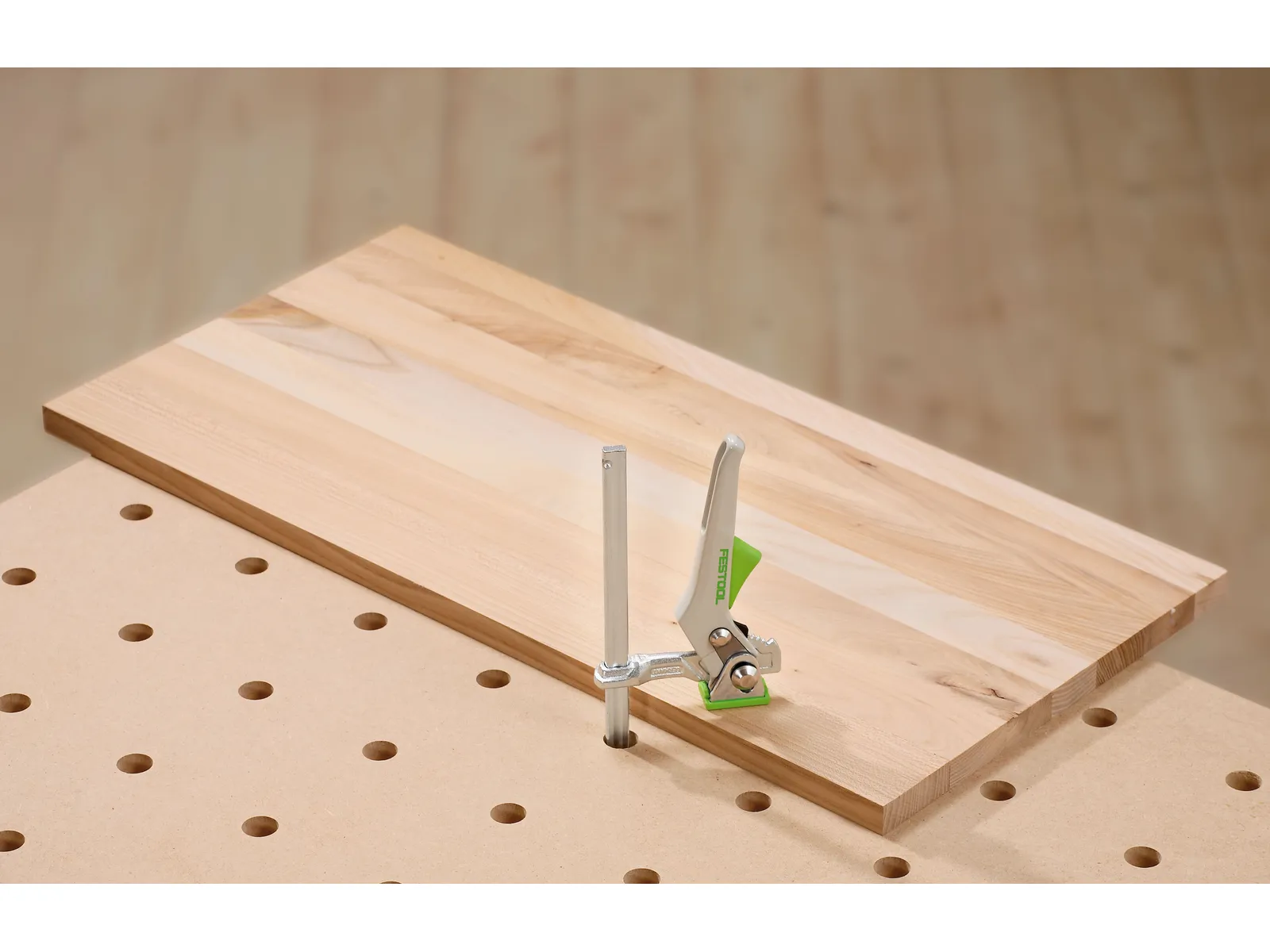 Используется при работе с направляющими Festool, многофункциональными столами и станками для фиксации деталей во время пиления, фрезерования и других операций.