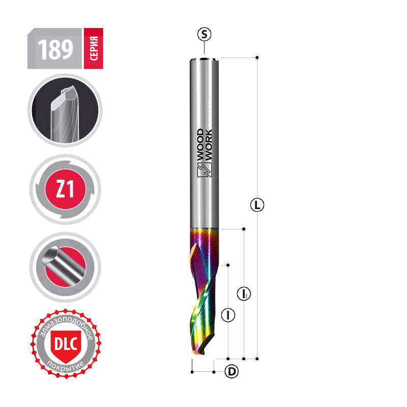 Фреза спиральная HSS M35 по алюминию и пластикам ПВХ Z1 d8×20×D8×80L, DLC покрытие Woodwork/Вудворк 189.2080.08 предназначена для чистой и быстрой обработки алюминиевых сплавов. Одна режущая грань с восходящей спиралью Z1 обеспечивает эффективный выброс стружки вверх и стабильное качество реза.