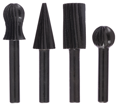 В комплект входят четыре шарошки различной формы, что позволяет эффективно работать с плоскими, цилиндрическими и фигурными элементами. Инструмент обеспечивает контролируемое снятие материала и аккуратную корректировку контуров.