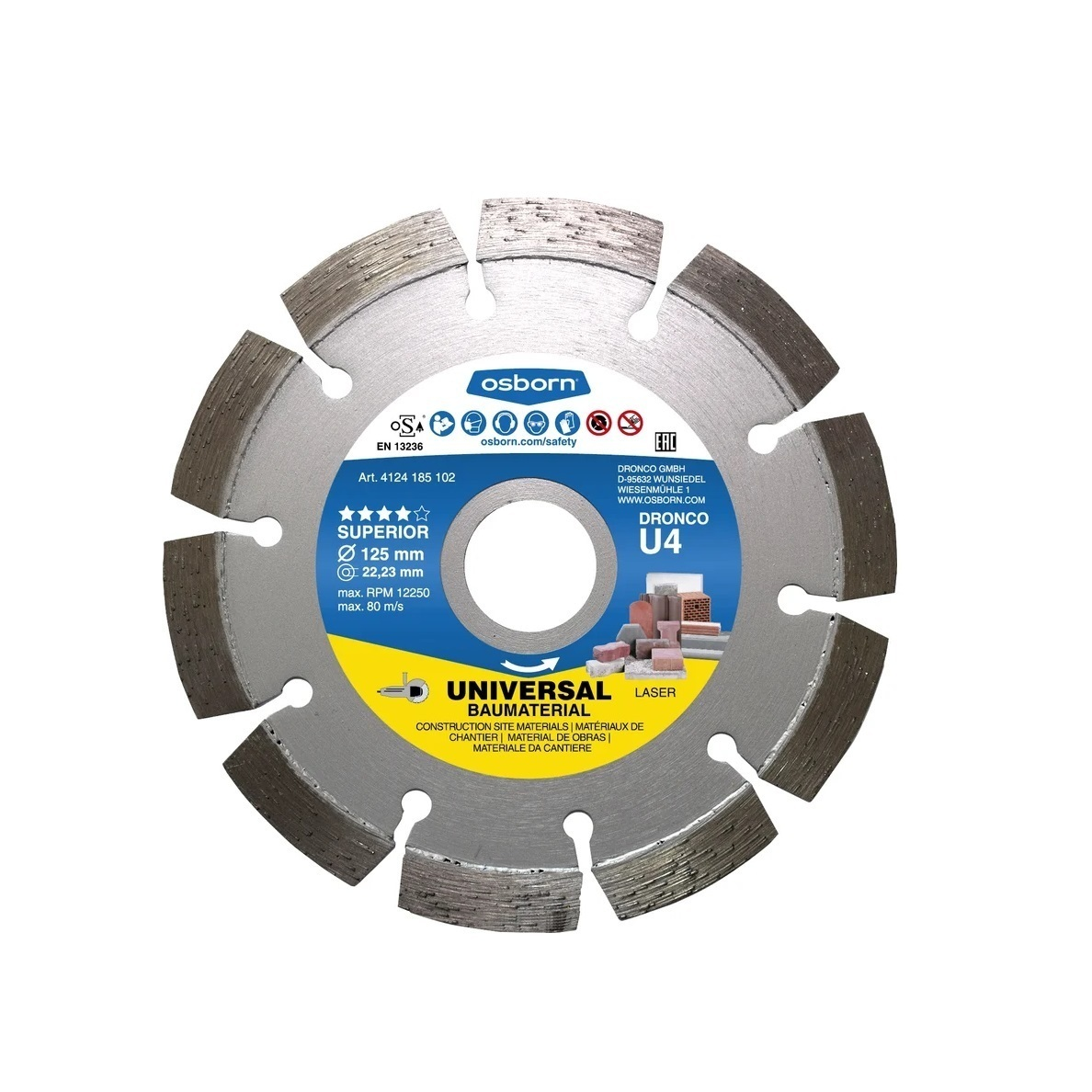 Алмазный сегментированный диск по бетону OSBORN U4 4124185 диаметром 125 мм предназначен для универсальной резки строительных материалов, включая бетон, бетон с открытым заполнителем, бордюрный камень, природный камень и кирпич. Лазерная сварка сегментов обеспечивает высокую прочность и надёжность диска при интенсивной работе.