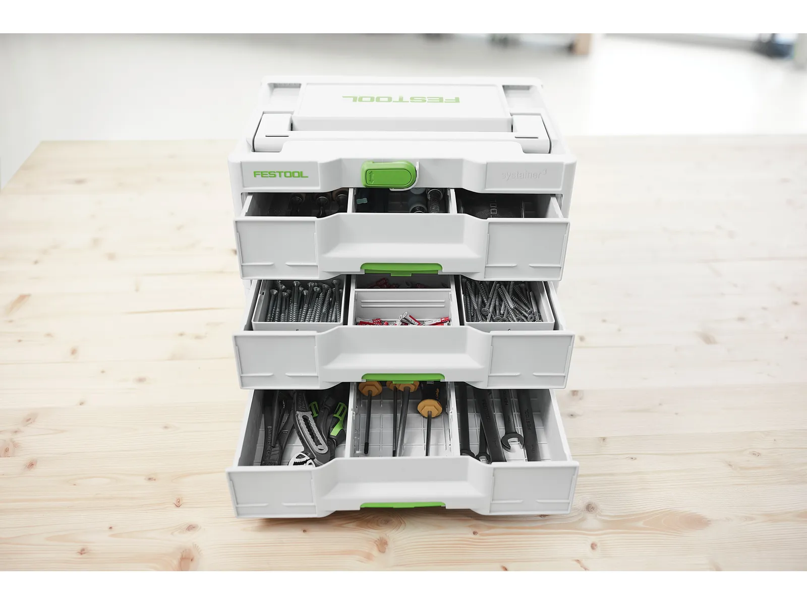 Sortainer³ SYS3-SORT/3 M 337 обеспечивает удобное хранение и быструю организацию аксессуаров и мелких деталей. Три выдвижных ящика 343х271х66 мм можно индивидуально разделить перегородками или пластиковыми контейнерами, что позволяет держать под рукой гвозди, дюбели, шурупы и ручной инструмент.