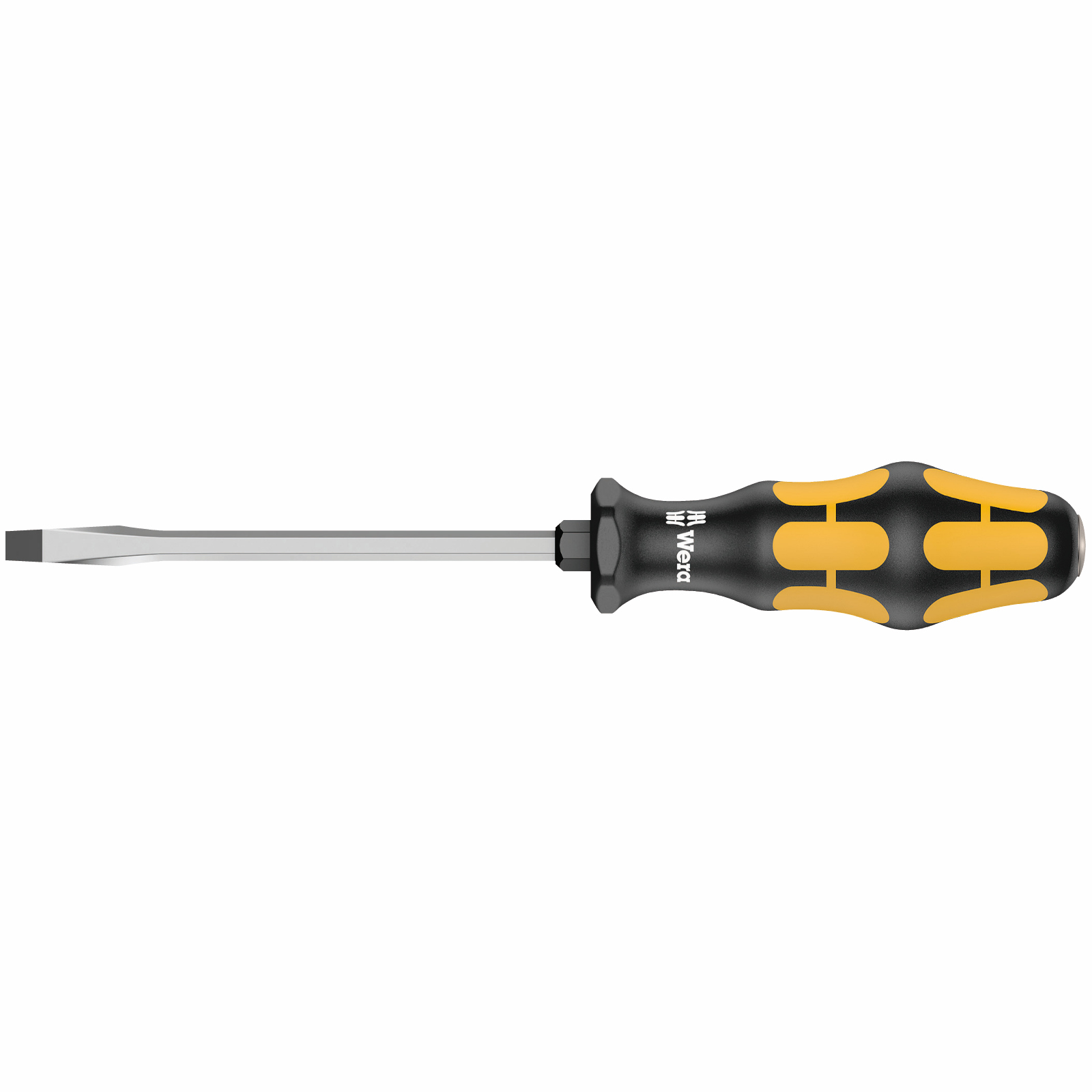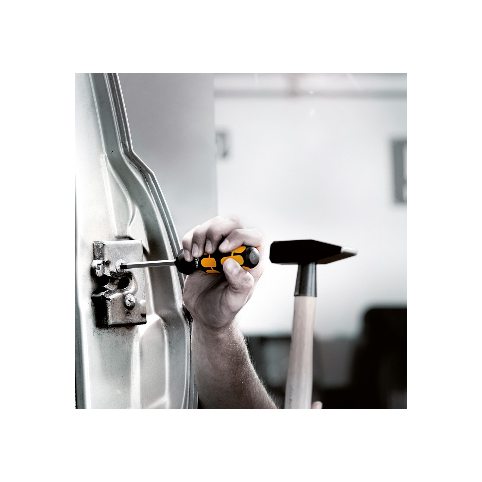 Шлицевая ударная отвёртка Wera 1,6x9x150 мм (артикул 05018268001) предназначена для работы с винтами со шлицем, где требуется высокая передача крутящего момента и возможность ударного воздействия. Сквозной шестигранный стержень выполнен из прочной легированной стали и оснащён ударным наболдашником, что позволяет безопасно использовать инструмент с молотком без потери усилия.